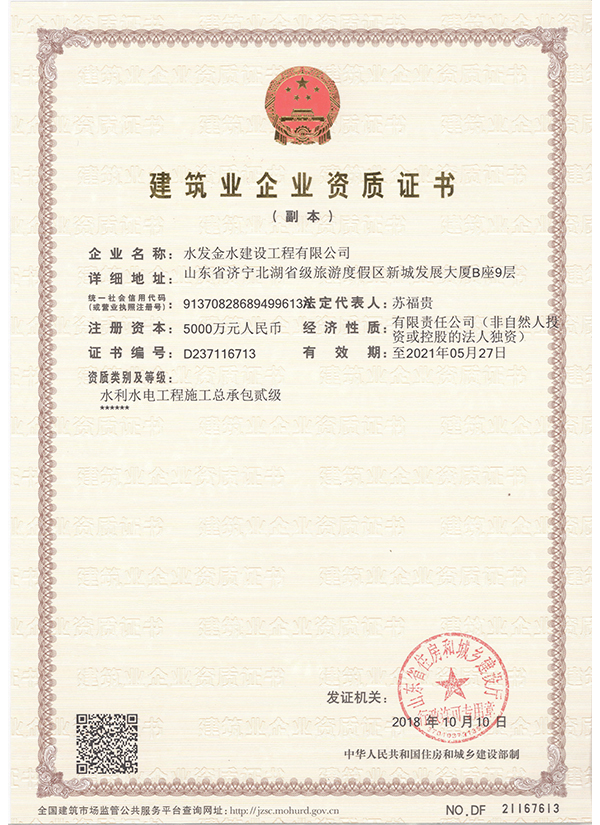 水發(fā)金水建設(shè)工程有限公司 水利水電資質(zhì)證書