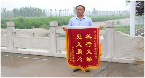 8月1日,汶上縣中都水務(wù)發(fā)展有限公司院內(nèi)熱鬧非常,渠莊戶村民渠XX攜其家人將一面寫著“善行義舉 見義勇為”的錦旗送到了陸敦嶺手中,以感謝其救命之恩。