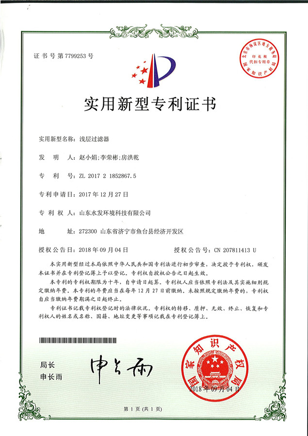 近日,山東水發(fā)環(huán)境科技有限公司申報(bào)的“淺層過濾器”獲國家實(shí)用新型專利證書。