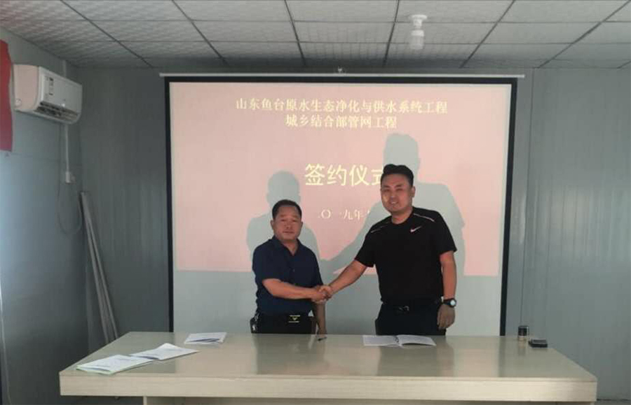 5月21日下午,山東魚臺原水生態(tài)凈化與供水系統(tǒng)工程城鄉(xiāng)結(jié)合部管網(wǎng)工程施工簽約儀式在魚臺縣順利舉行。水發(fā)金水建設(shè)工程有限公司總經(jīng)理蘇福貴、山東水發(fā)賢達水務(wù)有限公司總經(jīng)理潘愛國出席并簽訂了合同。