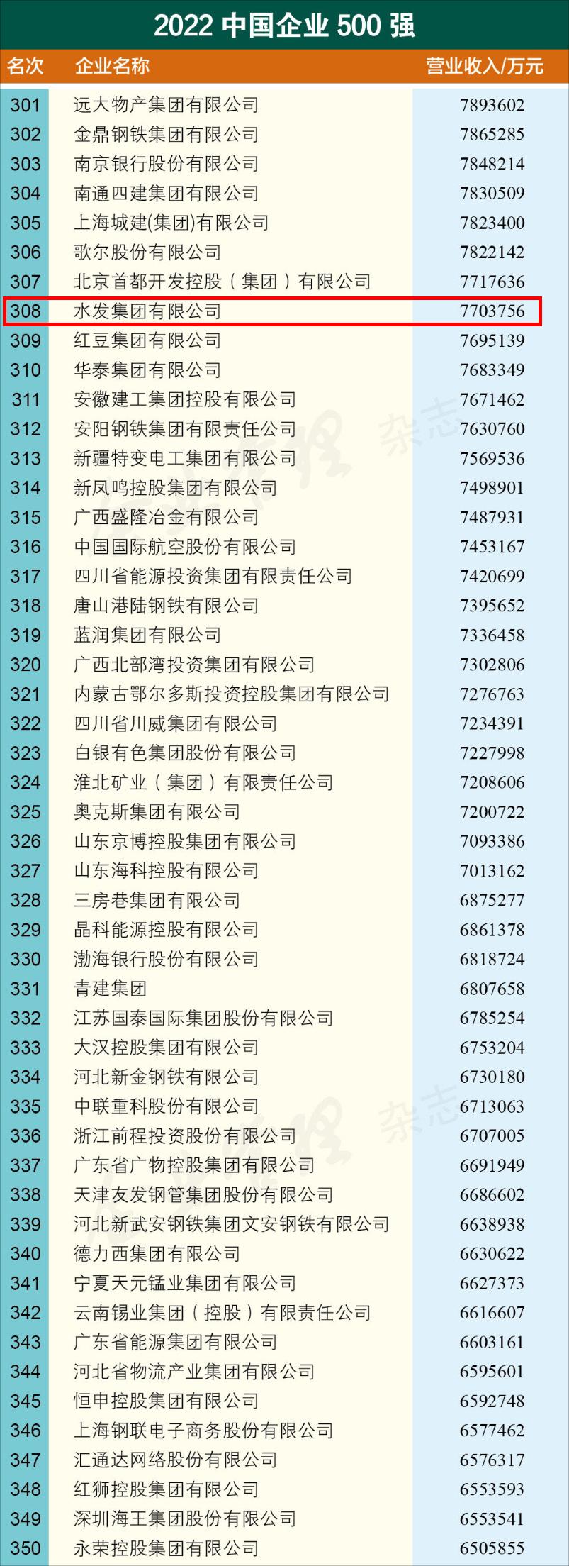 2022年9月6日,中國(guó)企業(yè)聯(lián)合會(huì)、中國(guó)企業(yè)家協(xié)會(huì)在京舉辦新聞發(fā)布會(huì),發(fā)布了“2022中國(guó)企業(yè)500強(qiáng)”榜單。作為山東省屬?lài)?guó)有企業(yè)的水發(fā)集團(tuán)本次排名位列第308位,較去年提升126位。