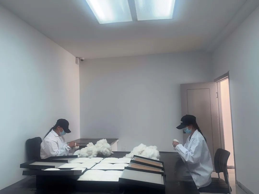 ▲庫車水控軋花廠棉檢員鐘丹、戚娜在崗進(jìn)行棉檢技術(shù)練習(xí)。