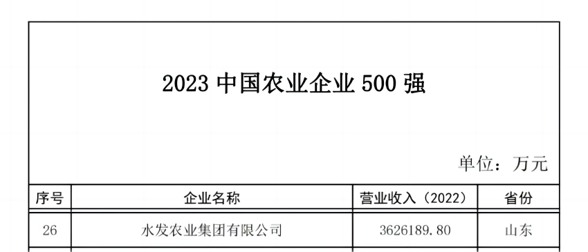 12月20日,“2023年中國農(nóng)業(yè)企業(yè)500強(qiáng)”榜單正式發(fā)布。水發(fā)農(nóng)業(yè)集團(tuán)位列第26位,較去年提升11位。