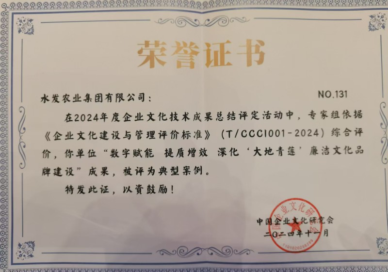 近日,由中國企業(yè)文化研究會主辦的“培育一流文化 塑造一流品牌-中外企業(yè)文化 2024 峰會”在江西南昌召開。水發(fā)農(nóng)業(yè)集團創(chuàng)建的“大地青蓮”廉潔文化品牌評為優(yōu)秀典型案例。