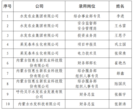 根據(jù)《水發(fā)集團(tuán)有限公司社會(huì)招聘公告》及有關(guān)要求,經(jīng)報(bào)名、資格審查、筆試、面試等程序及集團(tuán)黨委會(huì)研究,擬錄用李進(jìn)等10名人選(名單見附件),現(xiàn)予以公示。